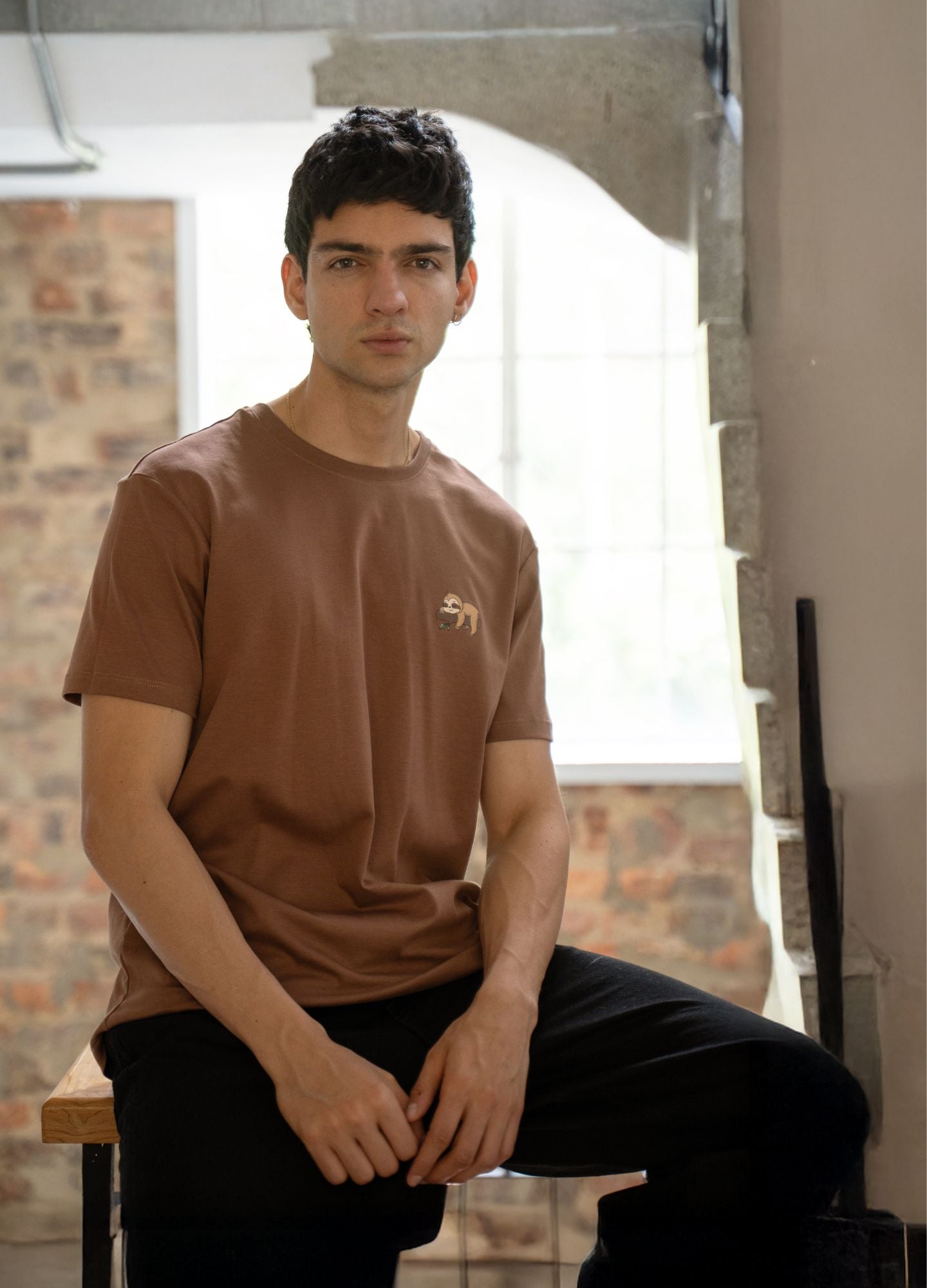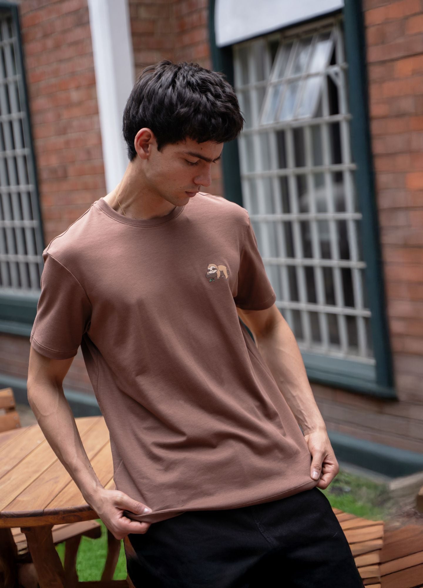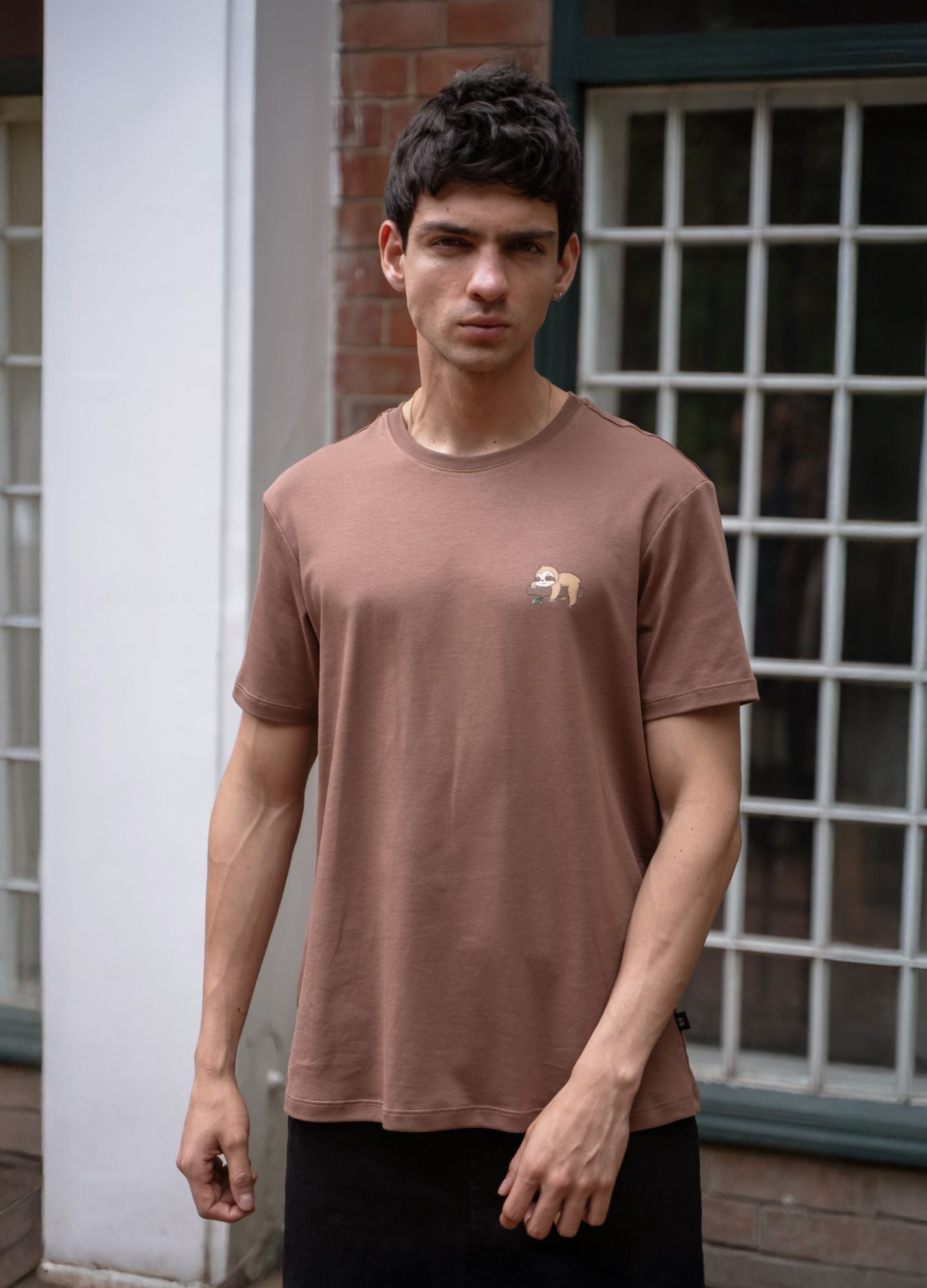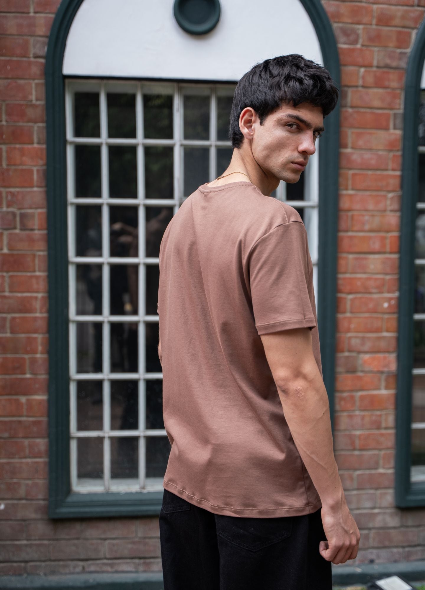 Camiseta confeccionada en algodón PIMA 100% de alta calidad, en color cafe. Su gramaje de 200 g/m² ofrece un tacto suave, mayor durabilidad y una caída firme que mantiene la forma con el uso. Presenta un corte regular con hombros caídos, logrando un estilo relajado y versátil para el día a día.
