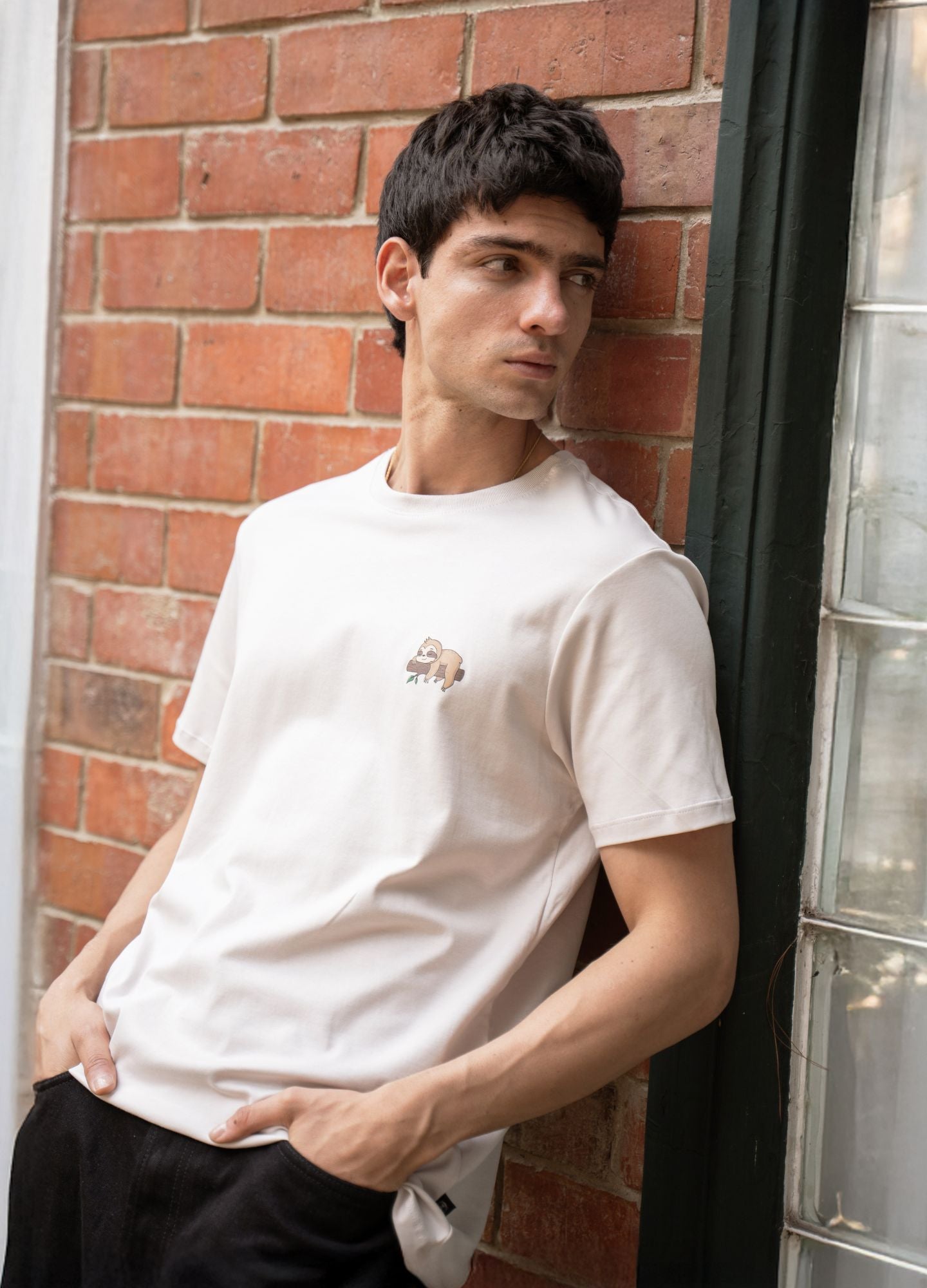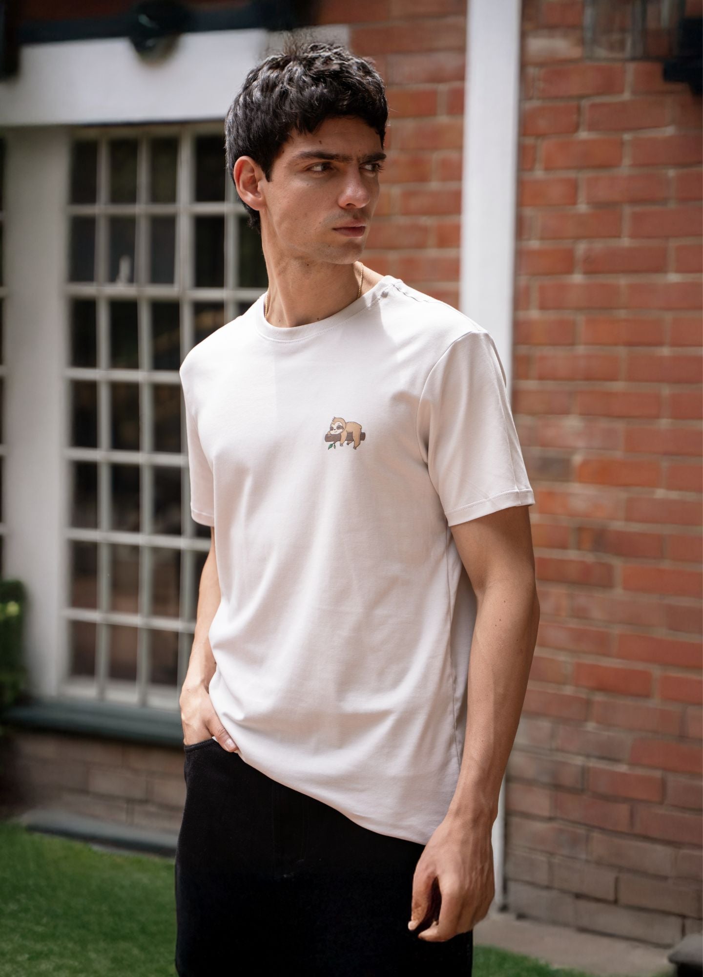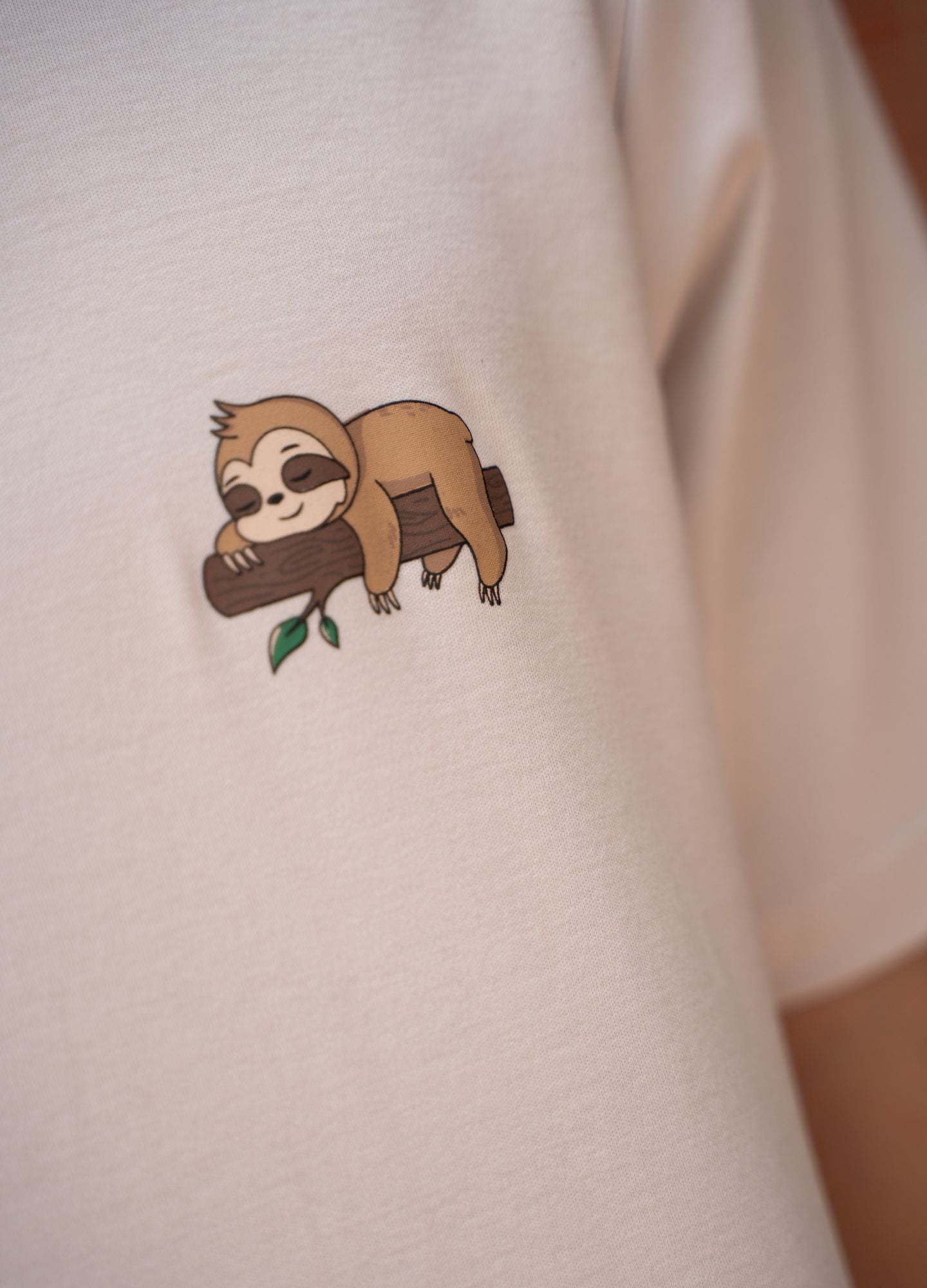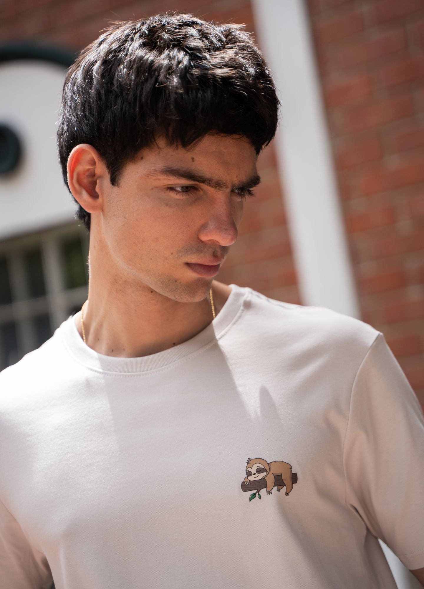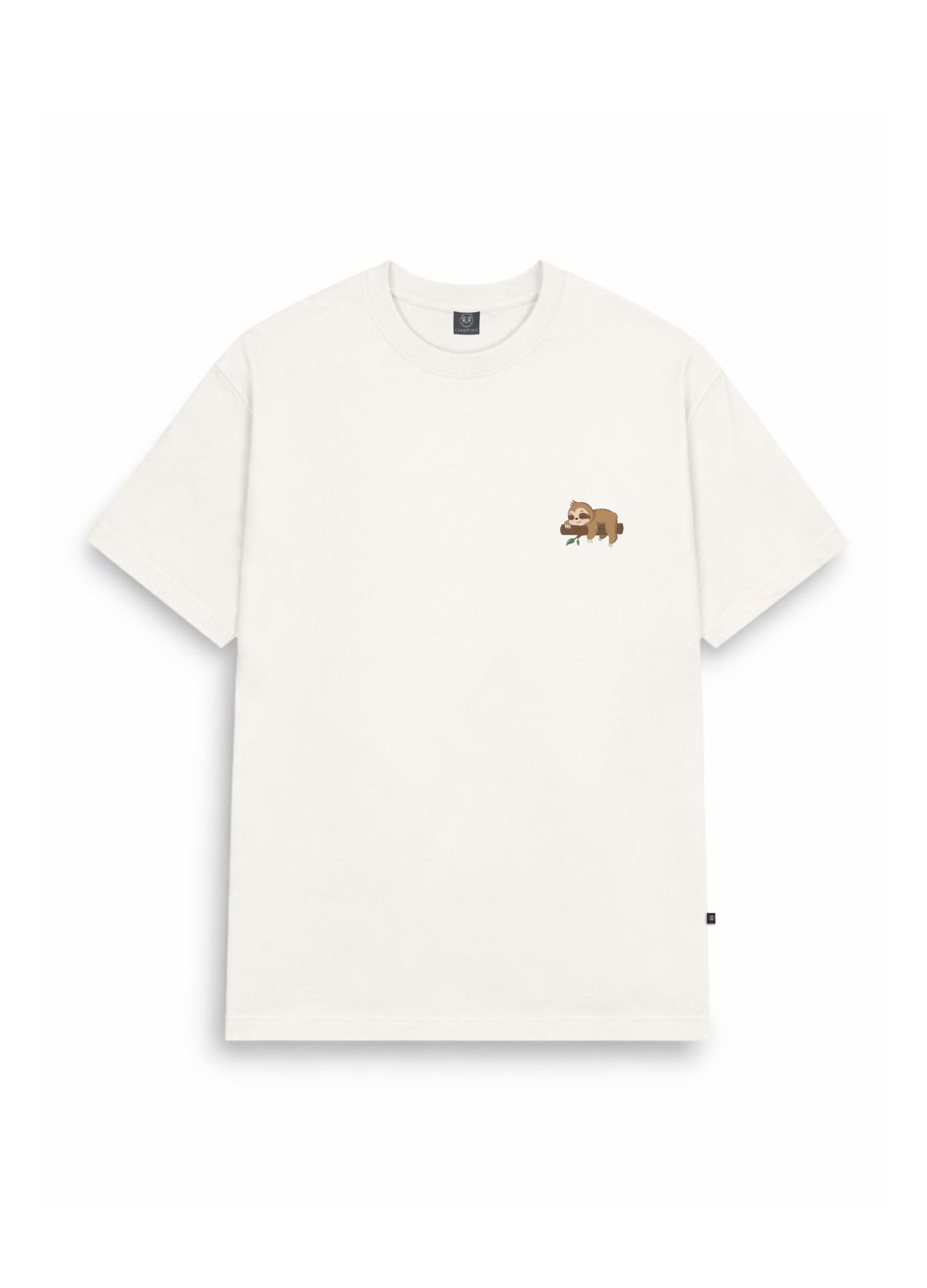 Se complementa con cuello en RIB 1x1 tono a tono y una bandera lateral con nuestro perezoso icónico, un detalle que refuerza la identidad de la marca.
