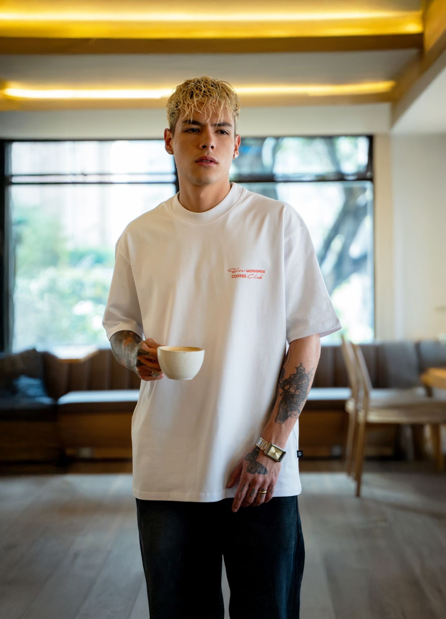 La prenda incorpora el diseño “Coffee Club”, inspirado en esas mañanas de domingo sin afán, acompañadas de un buen café. Cuenta con dos estampados en serigrafía: la frase principal ubicada en el pecho izquierdo y, en la espalda, un diseño del perezoso descansando sobre una taza de café, que refuerza la idea y aporta un acabado sutil y de carácter premium.