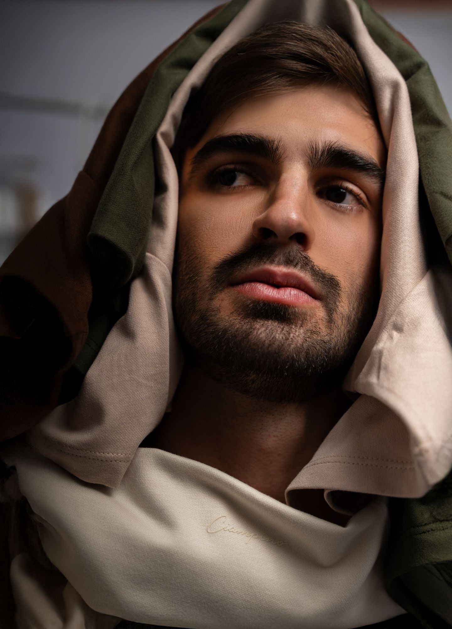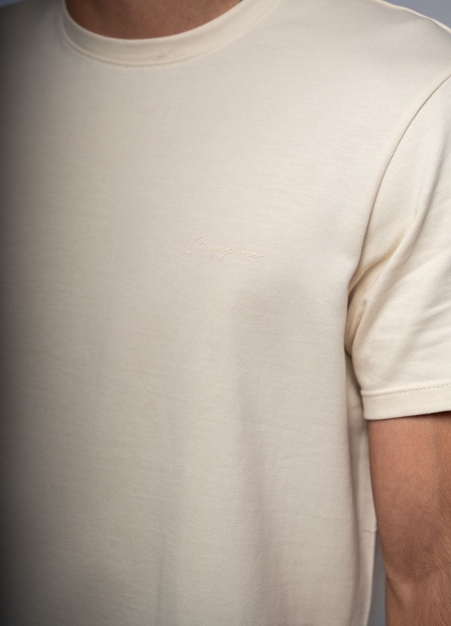 El diseño incluye un estampado en serigrafía crema con el logo de ciampino en trazo cursivo ubicado en el pecho izquierdo.