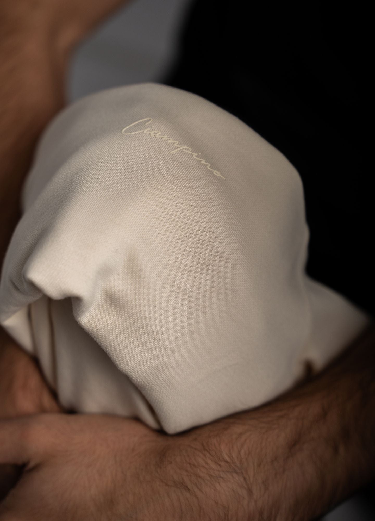 El diseño incluye un estampado en serigrafía taupe con el logo de ciampino en trazo cursivo ubicado en el pecho izquierdo.