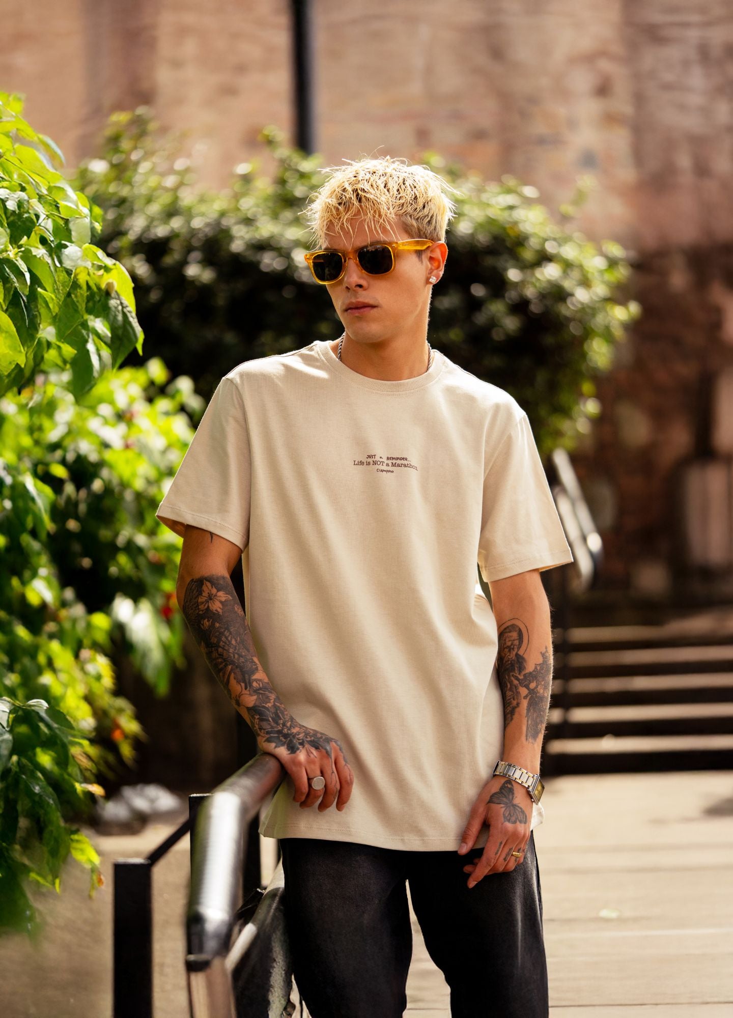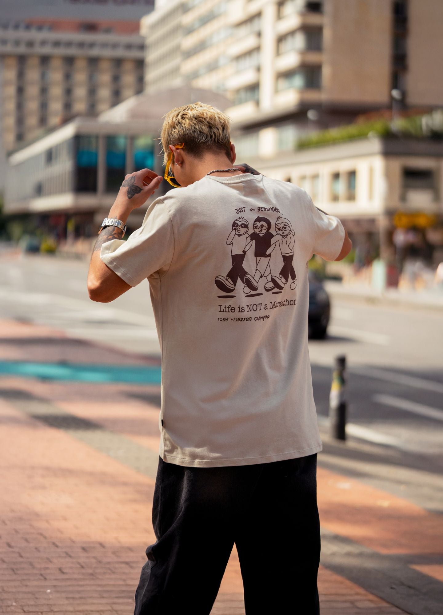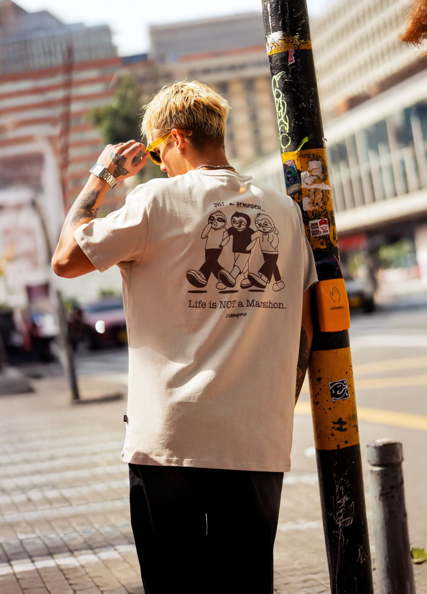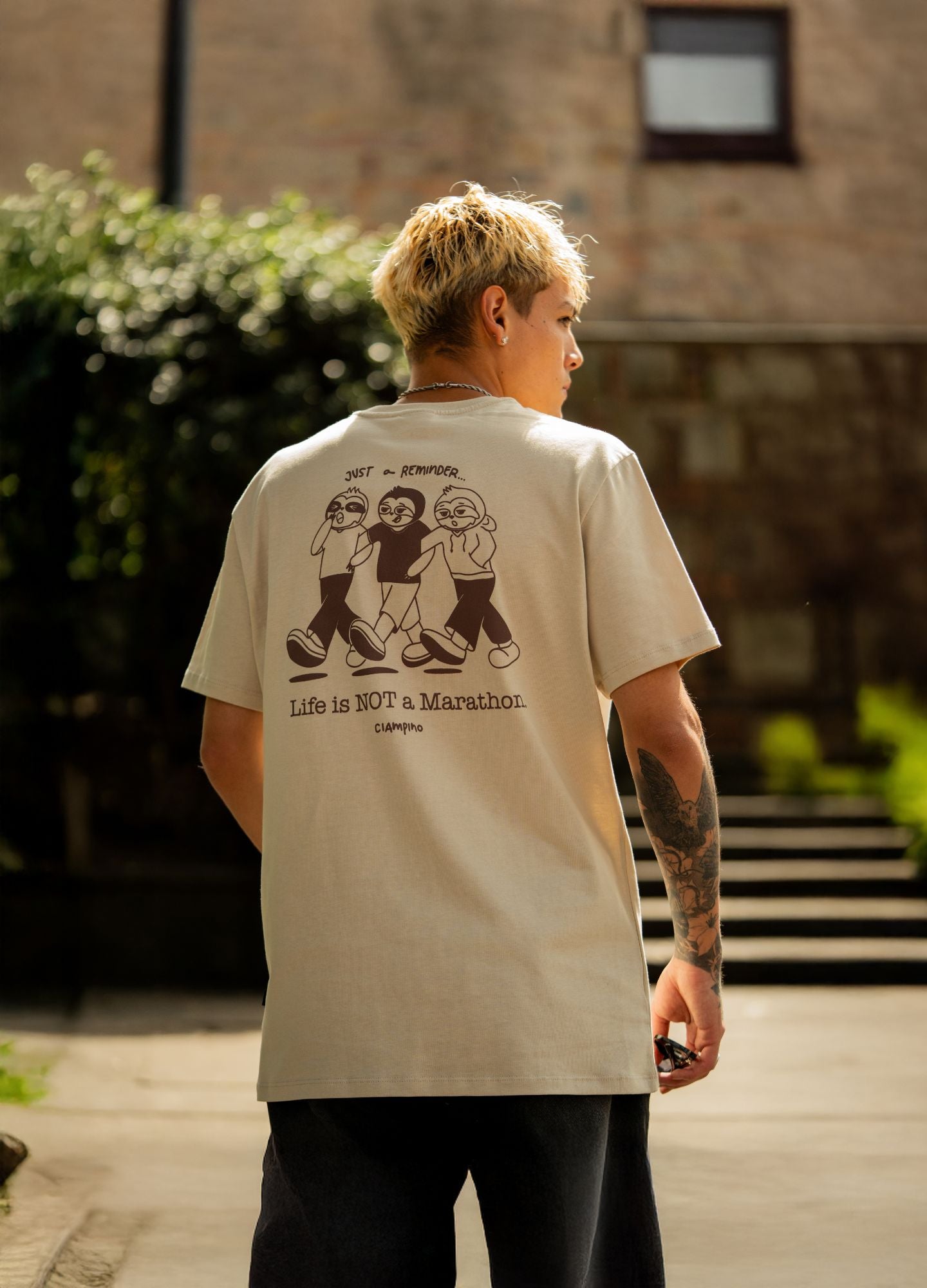 Camiseta 100% algodón en color crema, con un gramaje de 180 g/m² que ofrece una textura suave, fresca y cómoda para el uso diario. Su diseño "Not a Marathon" presenta a unos perezosos caminando sin prisa por la vida.