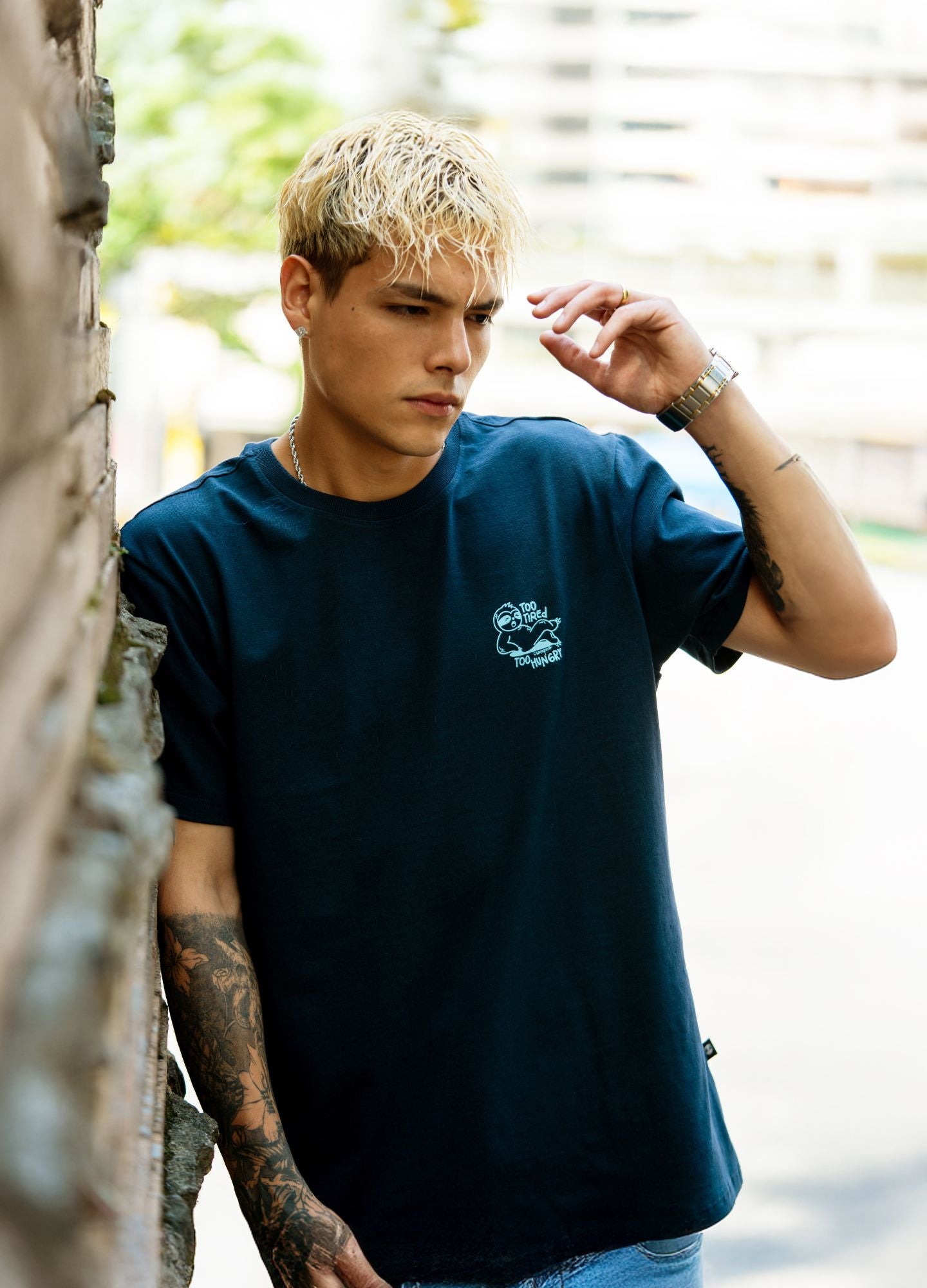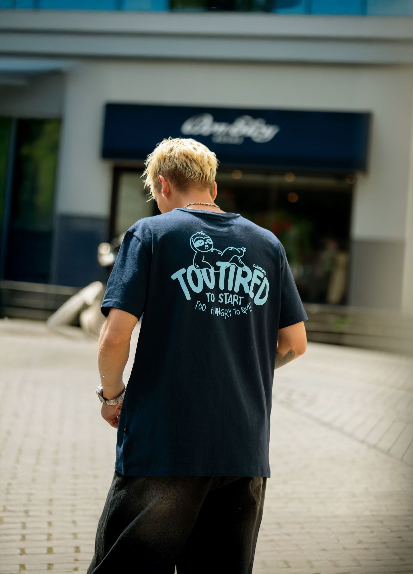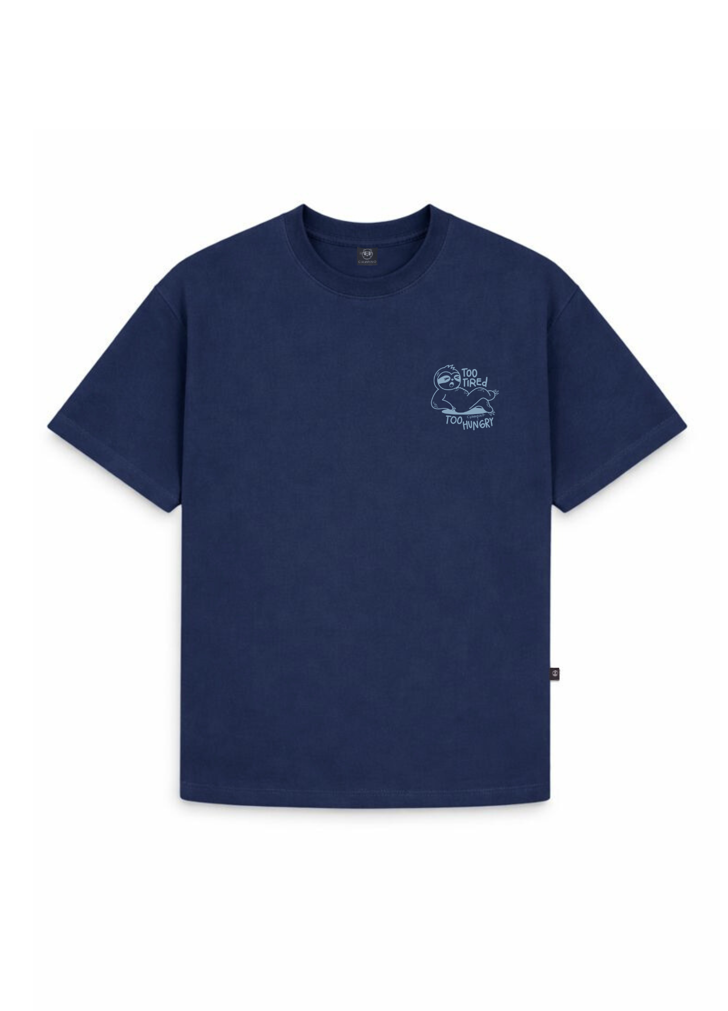 Camiseta 100% algodón en color azul, con un gramaje de 180 g/m² que ofrece una textura suave, fresca y cómoda para el uso diario. Su diseño “Too Tired” muestra a un perezoso relajado acompañado de la frase “Too tired to start, too hungry to quit”, un guiño al ritmo sin afán.