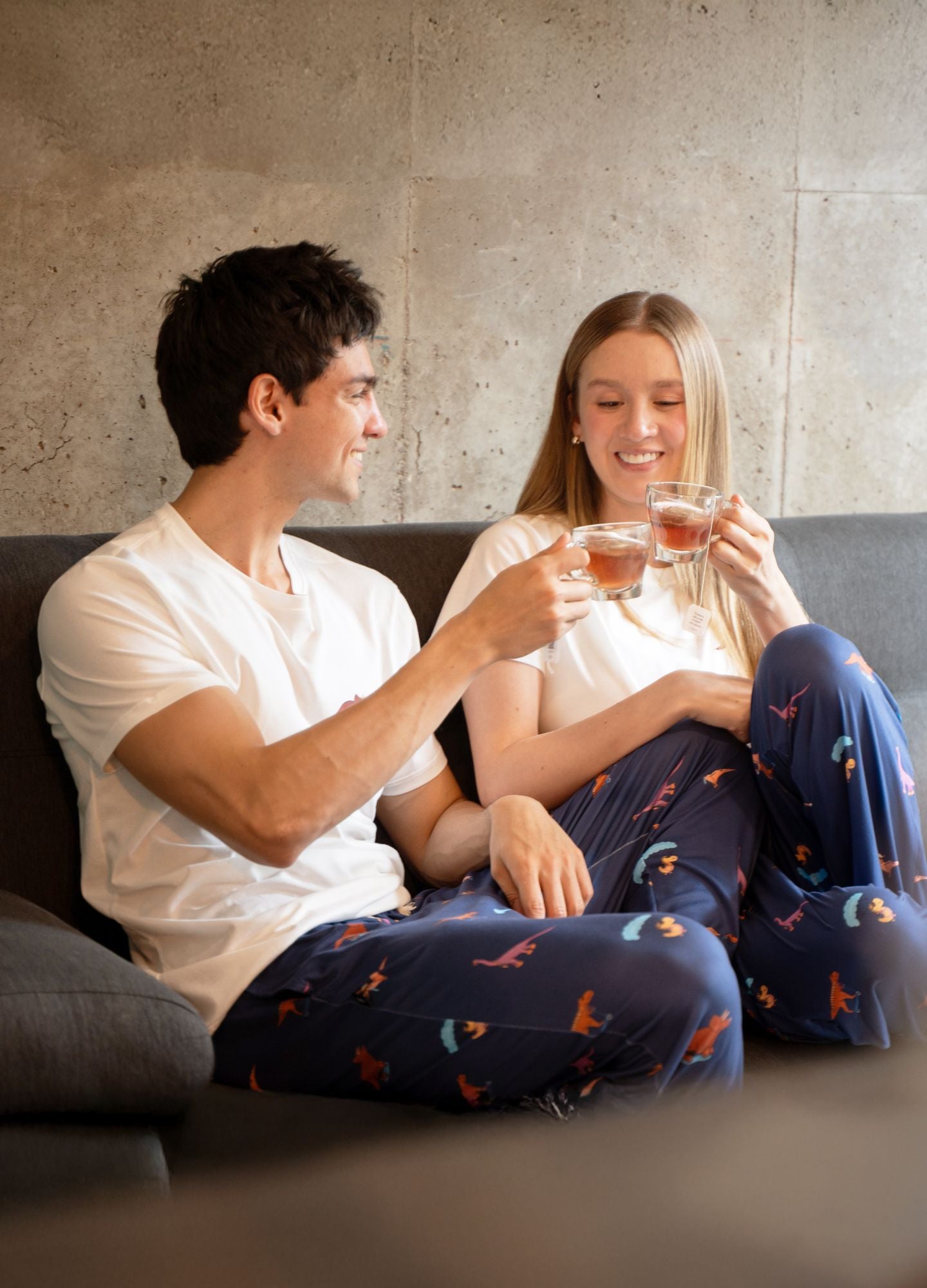 La prenda se complementa con una camiseta 100% algodón, disponible en color blanco, y en silueta crop top. Este pantalón es perfecto tanto para relajarte en casa como para salir cómoda al aire libre, y combina con otros diseños de la colección para lograr el perfect match con tu pareja.