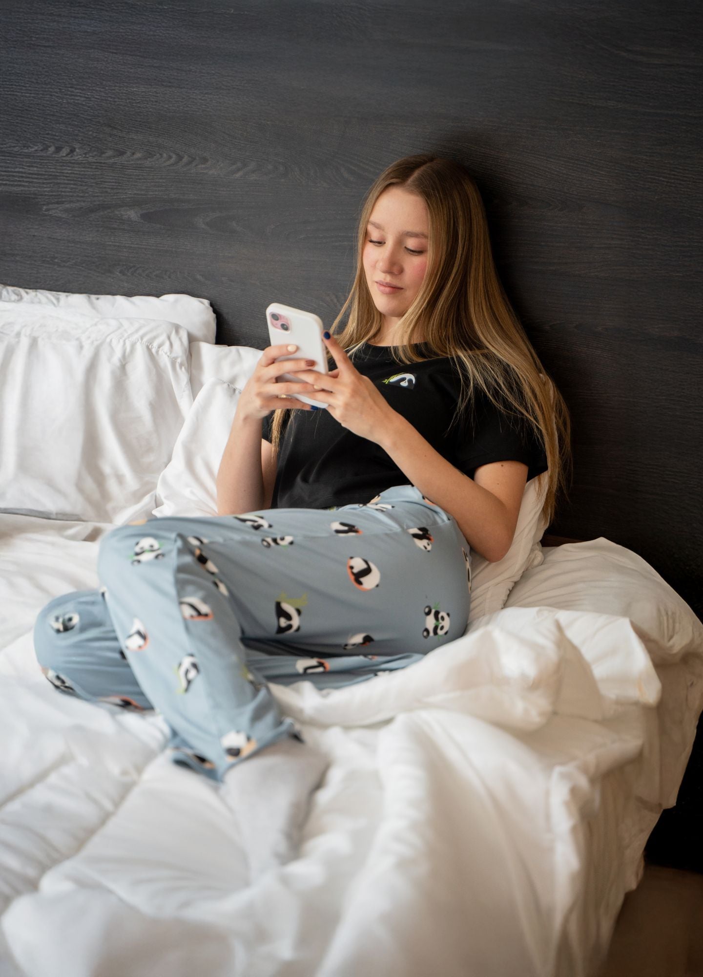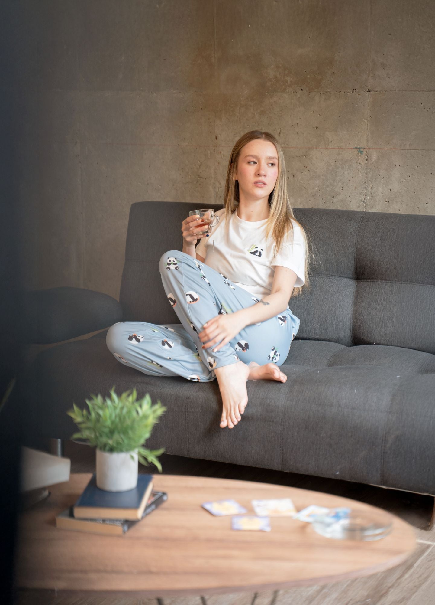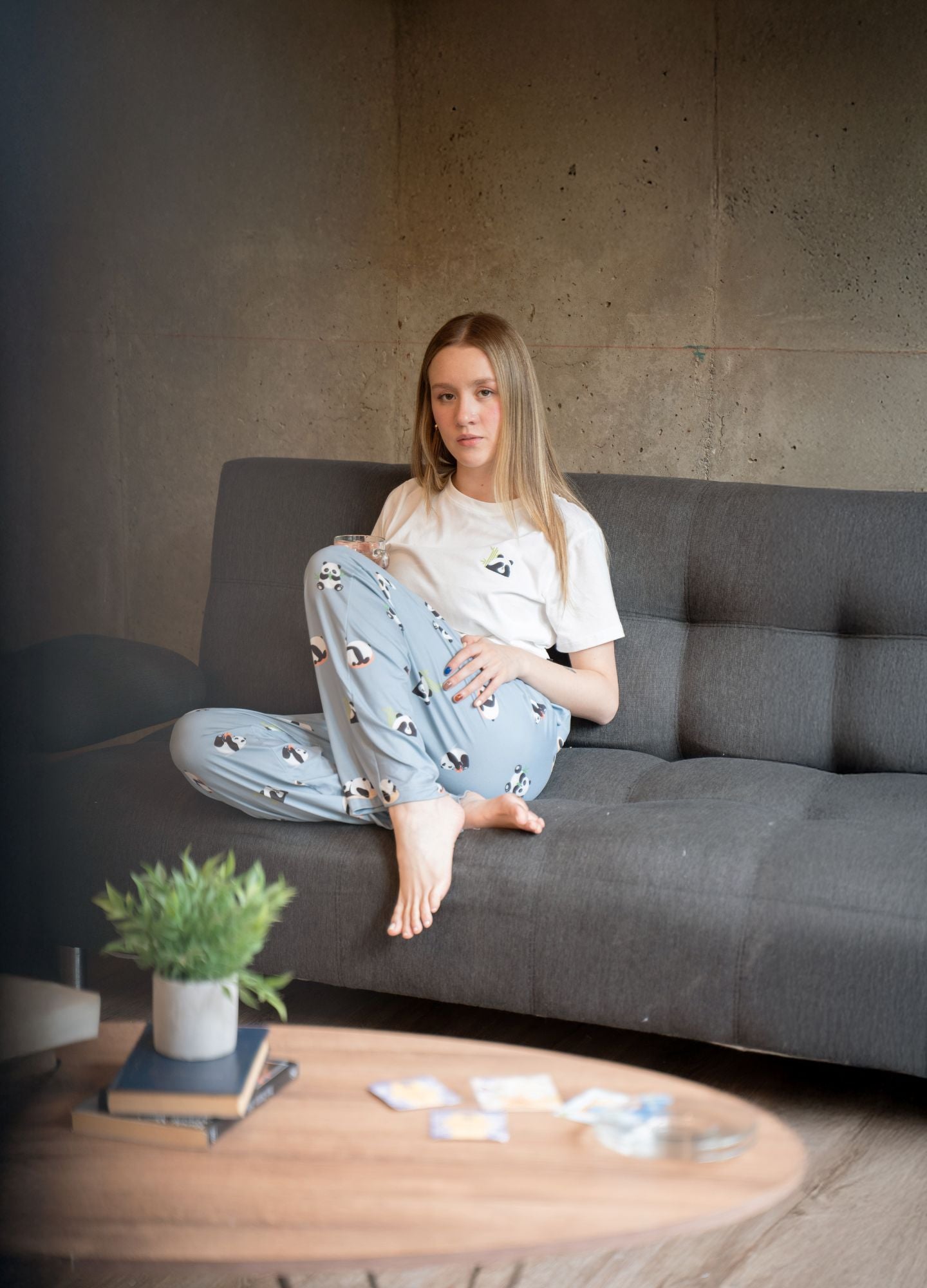 Conjunto de pijama compuesto por un pantalón color gris azulado en tela piel de durazno (95% poliéster, 5% spandex) con acabado extra soft y divertido print de pandas, gramaje de 170 g/m². Incluye dos bolsillos funcionales, cordón ajustable en algodón para mayor comodidad y bandera tejida con el rostro de nuestro perezoso en el bolsillo izquierdo.