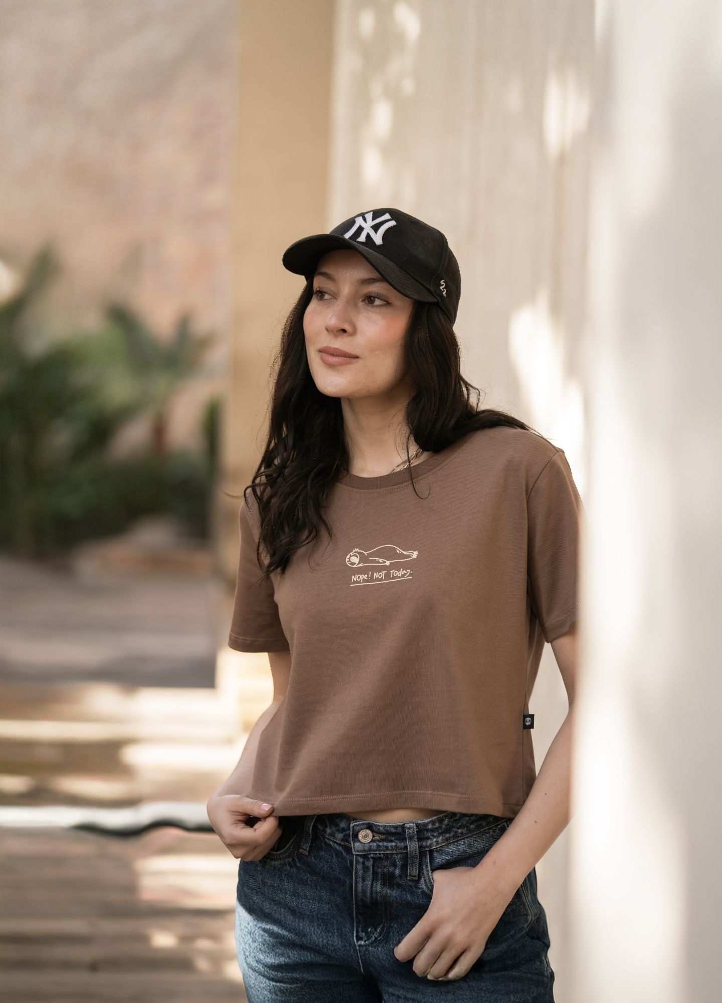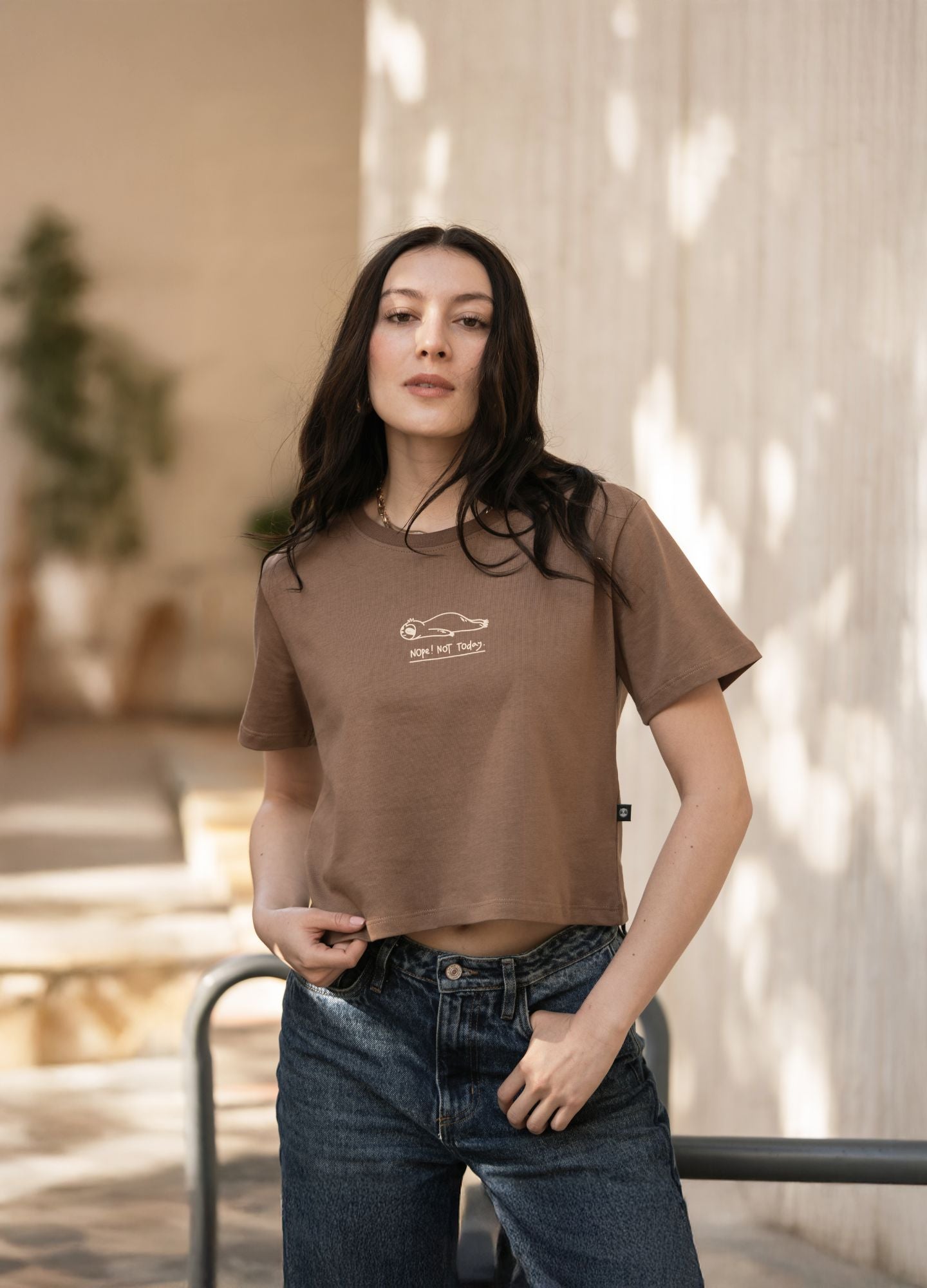 Crop Top 100% algodón en color cafe, con un gramaje de 180 g/m² que ofrece una textura suave, fresca y cómoda para el uso diario. Su diseño presenta un perezoso acostado sin ganas de hacer algo con la frase "Nope, Not Today" un símbolo de calma, descanso y del estilo de vida relajado que define a CIAMPINO.