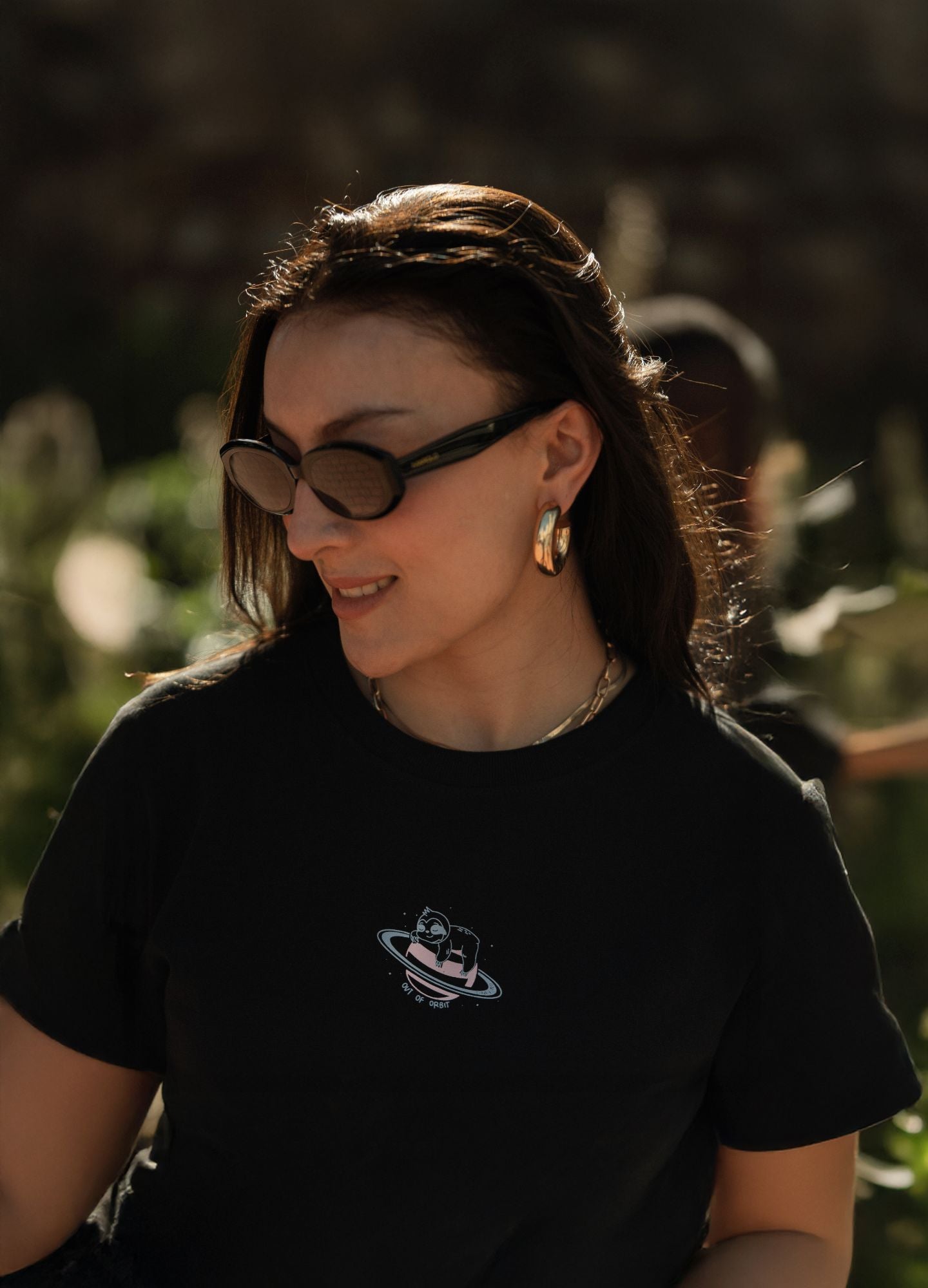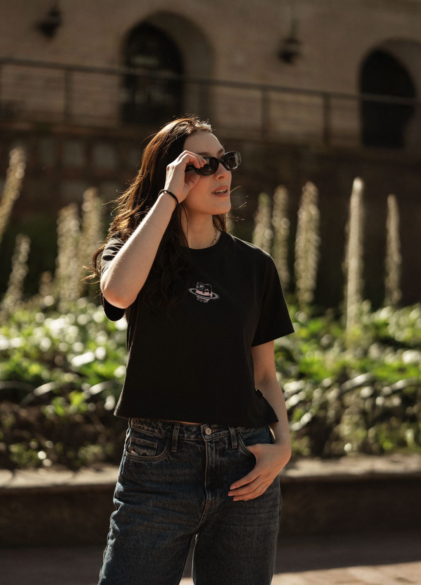 Crop Top 100% algodón en color negro, con un gramaje de 180 g/m² que ofrece una textura suave, fresca y cómoda para el uso diario. Su diseño presenta un perezoso acostado en un planeta, símbolo de calma, descanso y del estilo de vida relajado que define a CIAMPINO.