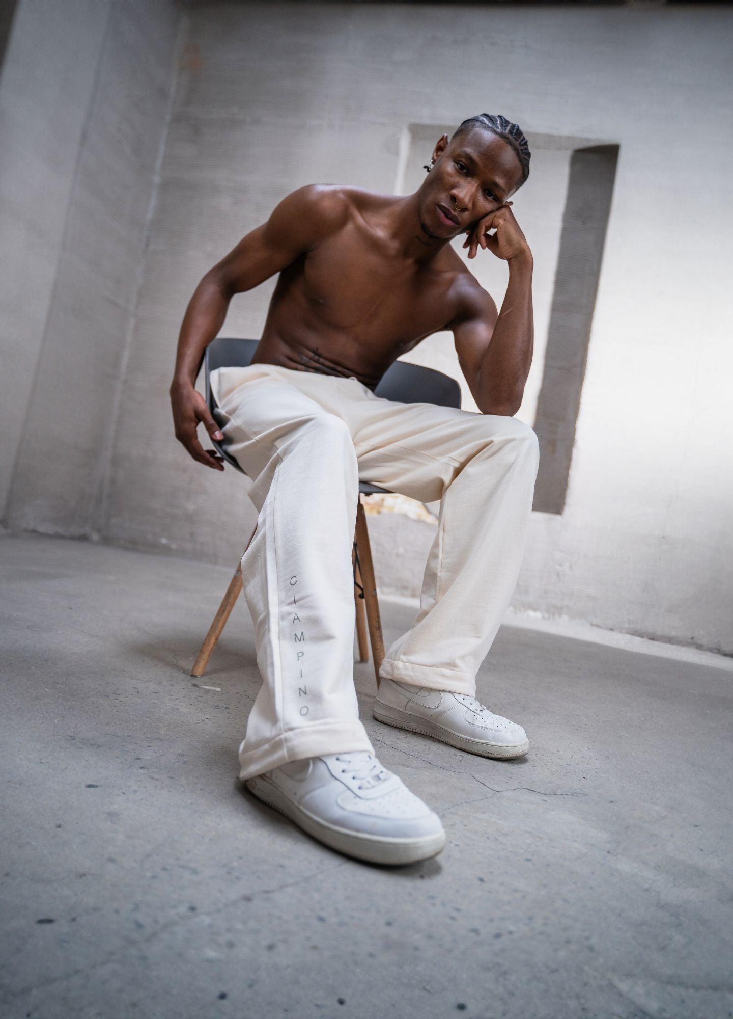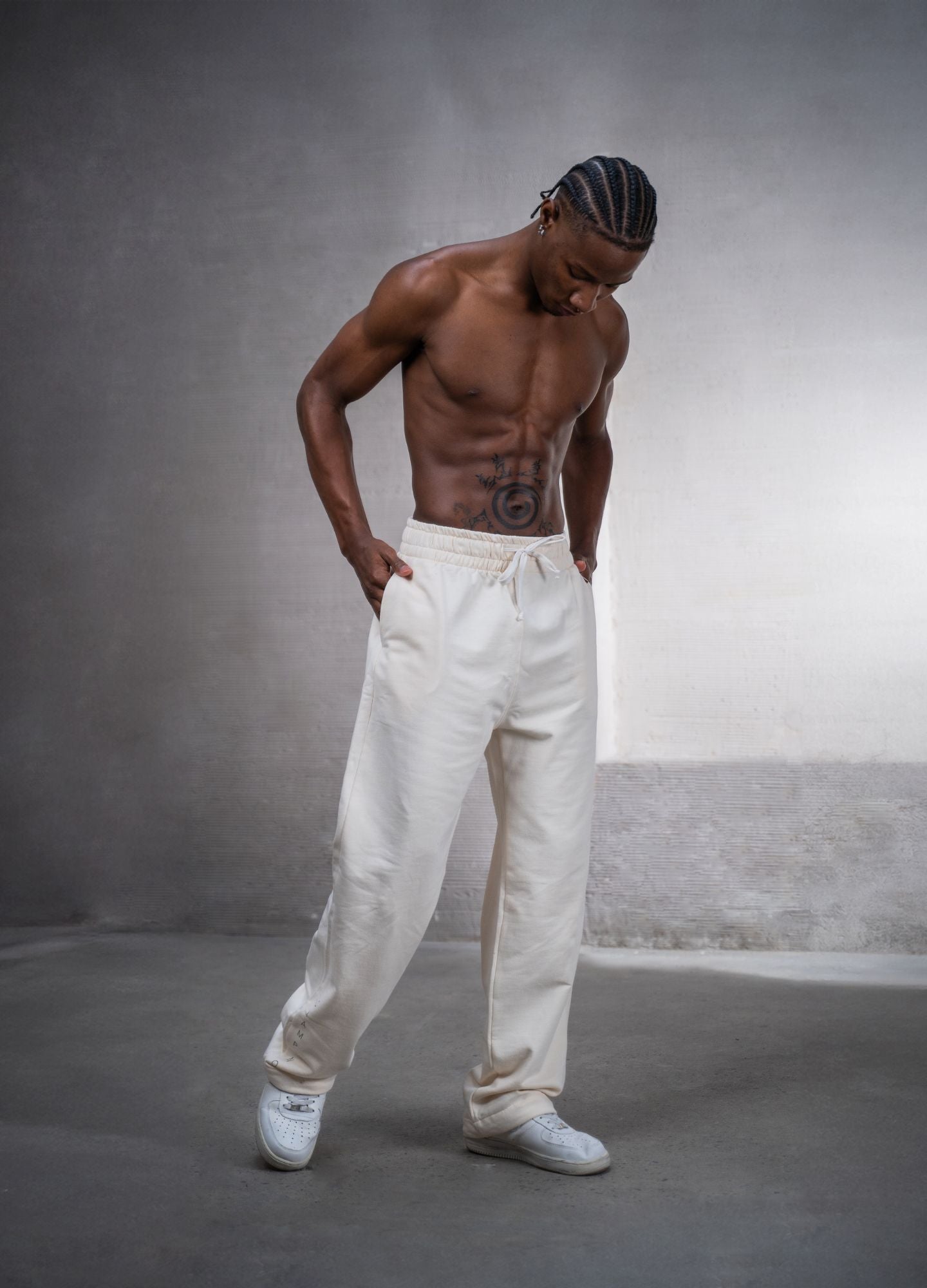 Pantalón 100% algodón PIMA de color crema, con un gramaje de 300 gr/m². Este modelo presenta un diseño clásico de bota recta.